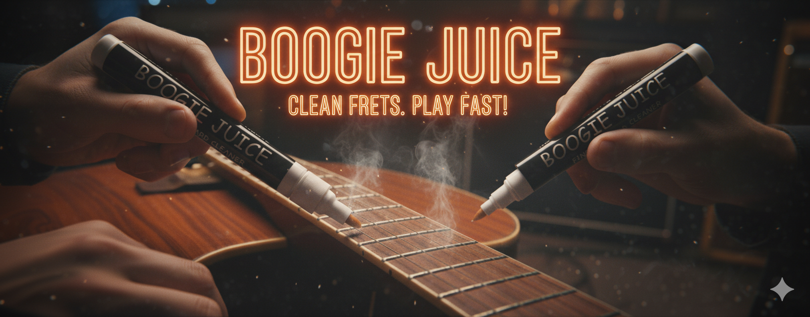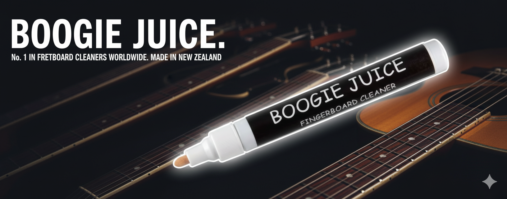 Boogie Juice is an all natural cleaning product developed in England in the 1980's. and brought back to New Zealand soon after. With its patented dispensing system Boogie Juice effectively removes dirt, finger grime and oily build up from your instruments finger/fretboard.